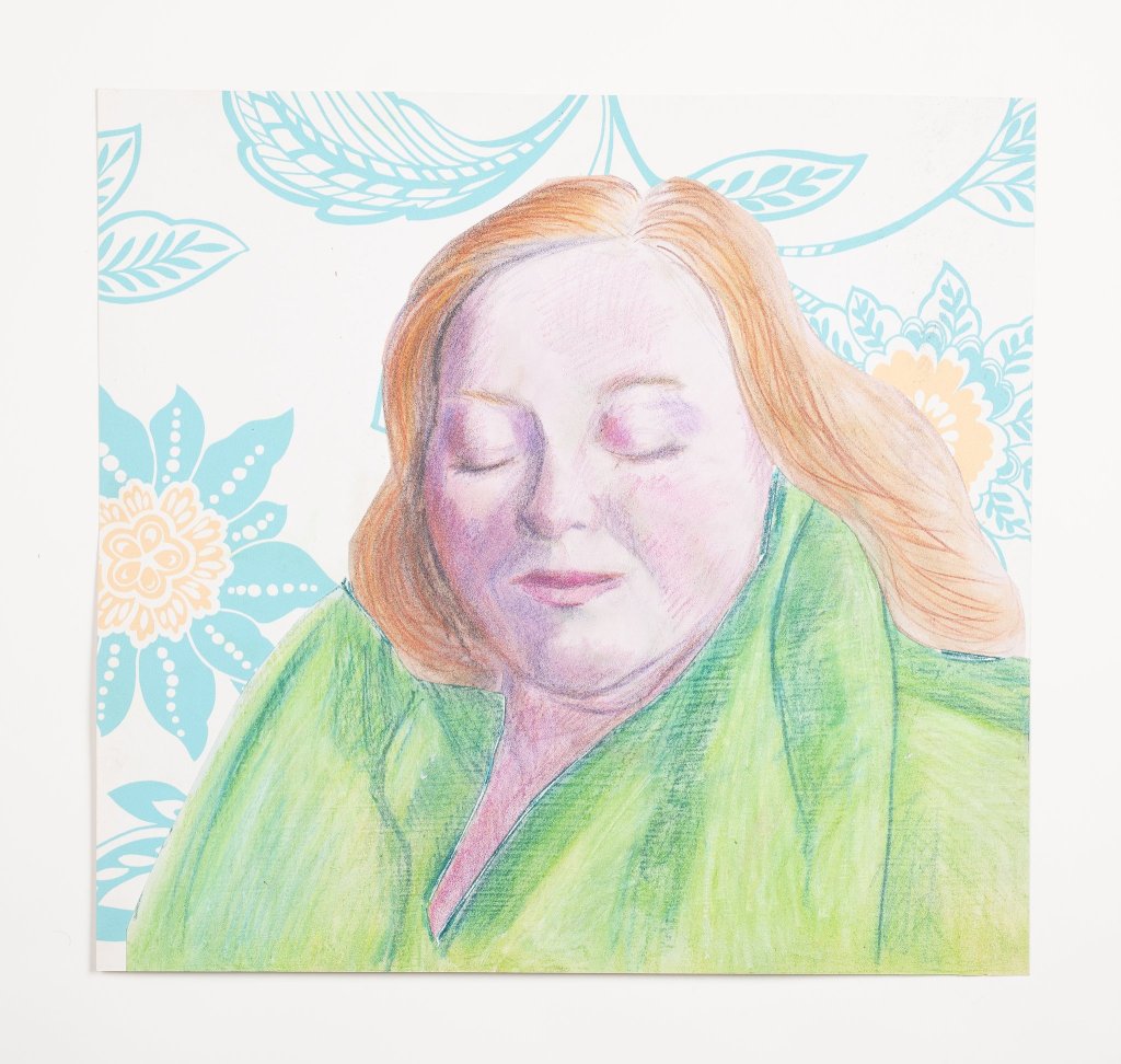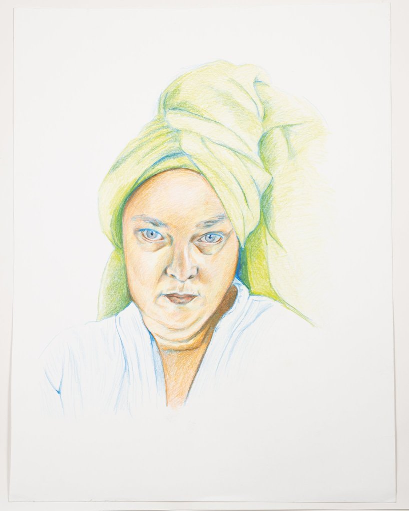 “Green towels! These are both after shower selfies. I am enjoying the parallel. My drawing of Suzanne is color pencil, china marker, on two different patterns of wallpaper sample.” – Kirsten Ervin