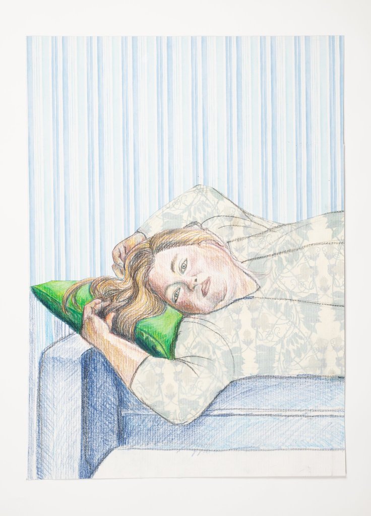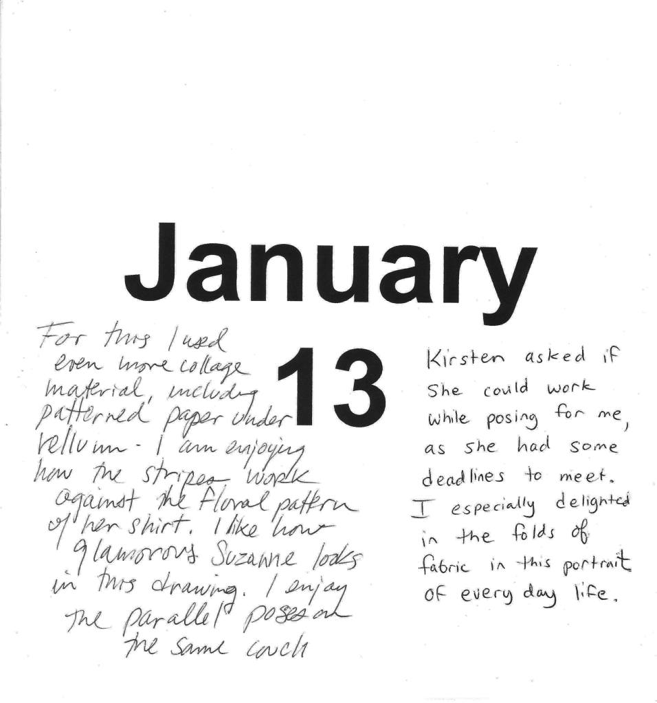 “For this I used even more collage material , including patterned paper under vellum. I am enjoying how the stripes work against the floral pattern of her shirt. I like how glamorous Suzanne looks in this drawing. I enjoy the parallel poses on the same couch.” – Kirsten Ervin