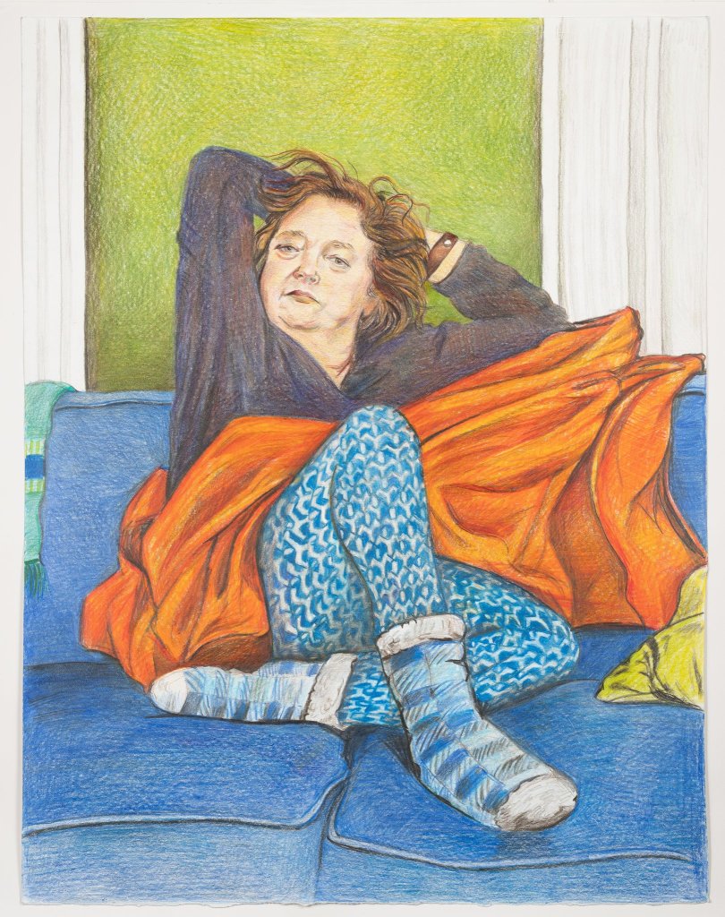 “This portrait is one of my favorites. We affectionately call it ‘Sexy Slippers’. I love the angle of her limbs and the color saturation of her surroundings. Those leggings were a pain in the ass to draw but I think it’s worth it.”