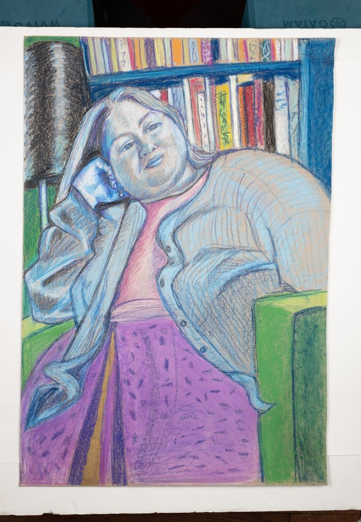 “I enjoy the different textures in this image, the bookshelves, the patterns on her skirt, on her sweater. Chalk pastel, china marker, color pencil on paper.”