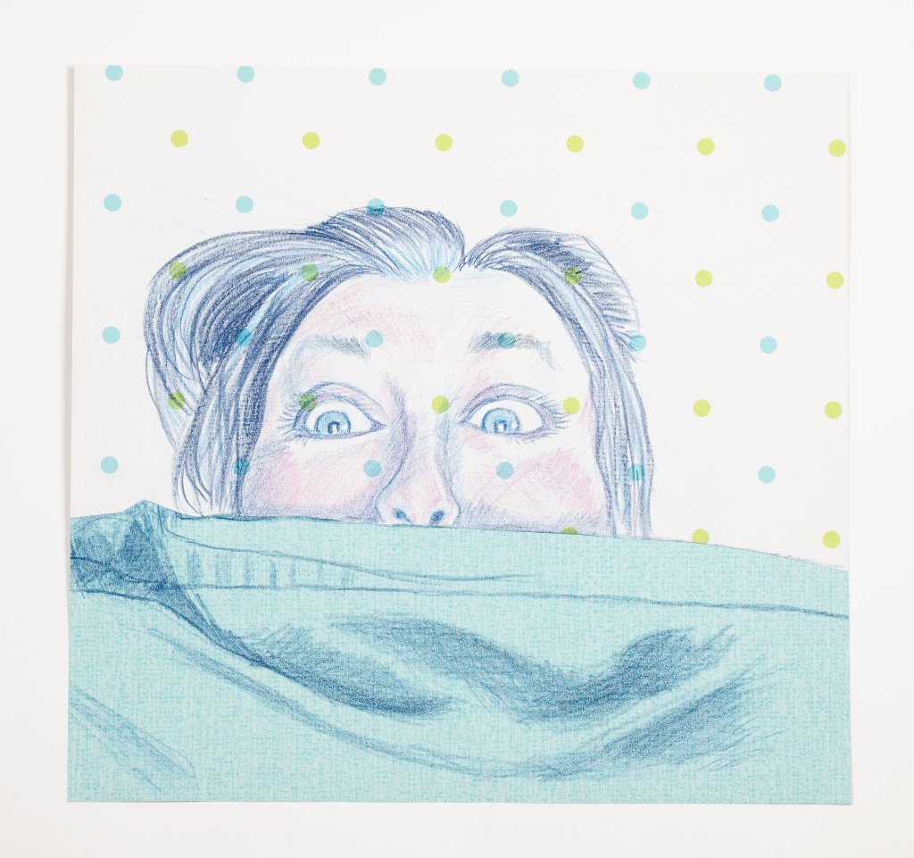 Suzanne in between the sheets! China marker and color pencil on two different patterns of wallpaper .