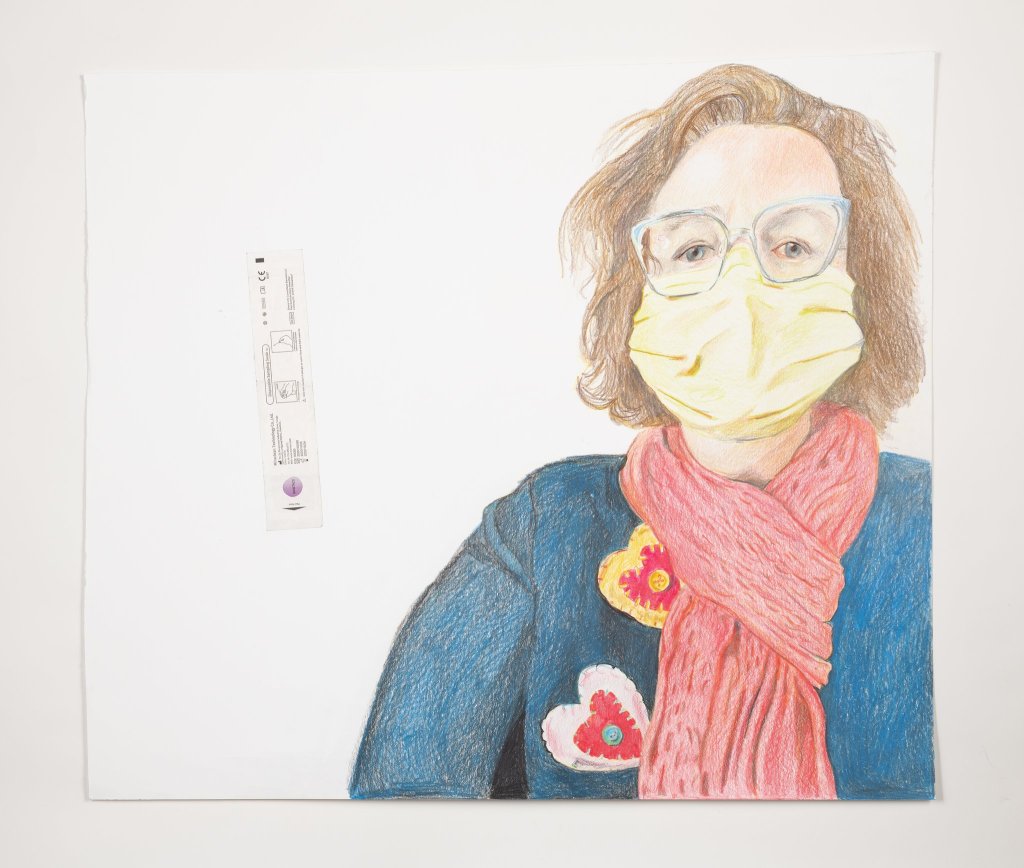 “This selfie was taken by Kirsten at the Society for Contemporary Craft after she taught a class in making fabric heart pins like the two on her jacket. To the left, I included the wrapper of a COVID test swab because I wished that I could be with her.” –