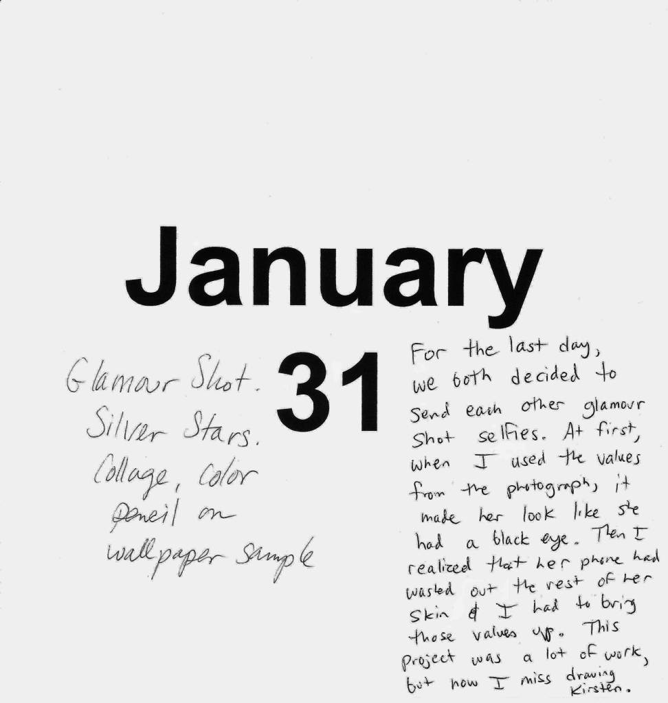 “For the last day, we both decided to send each other glamour shot selfies. At first, when I used the values from the photograph, it made her look like she had a black eye. Then I realized her phone had washed out the rest of her skin and I had to bring those values up. This project was a lot of work, but I miss drawing Kirsten.”
