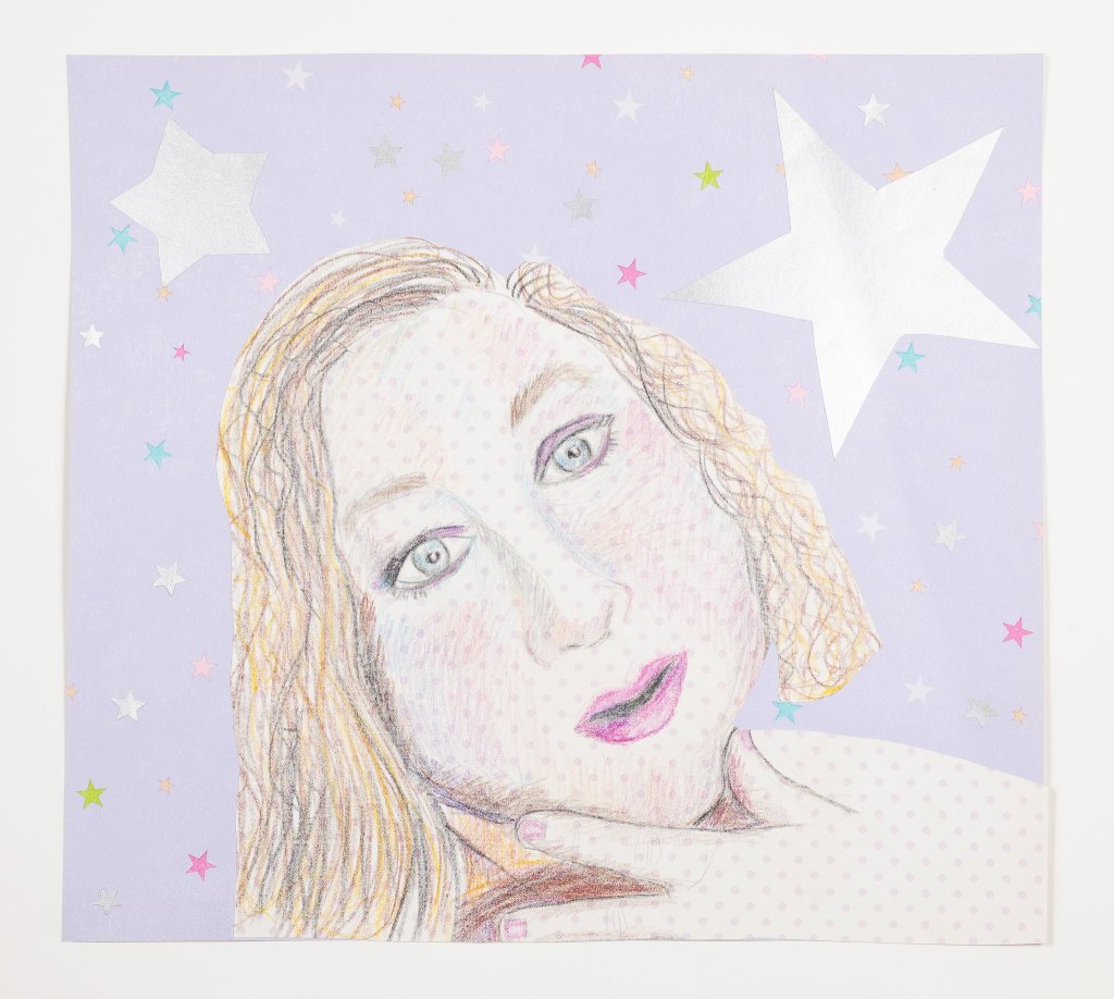“Glamour shot. Silver stars. Collage. Color pencil on wallpaper sample.”